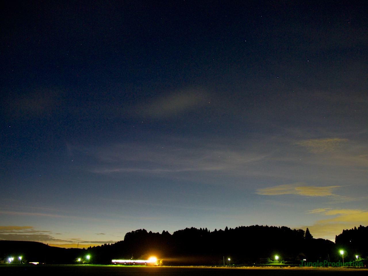 夜と昼の間 2012.08.11 夜がだんだん勢力を増して、昼間がどんどん後退して行く、そんな時間の上総川間駅。山の向こうから明かりを付けた列車がやってきた。もうすぐ昼間が白旗を揚げる。 E-5 | 11.0sec | f2.8 | iso200 | 14mm | 2012.08.04 | 下矢田