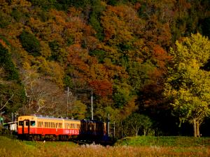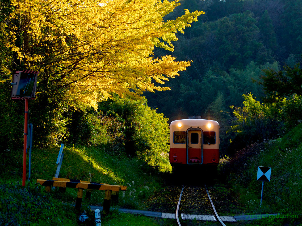 少し時間が戻りますが、先々週の加茂学園前のイチョウさんです。午後の陽を受けて奇麗に光っていたので、上り列車を待ってパチリ。この時点で既に左下の方は落葉が始まってますね。秋は短く儚いものです。