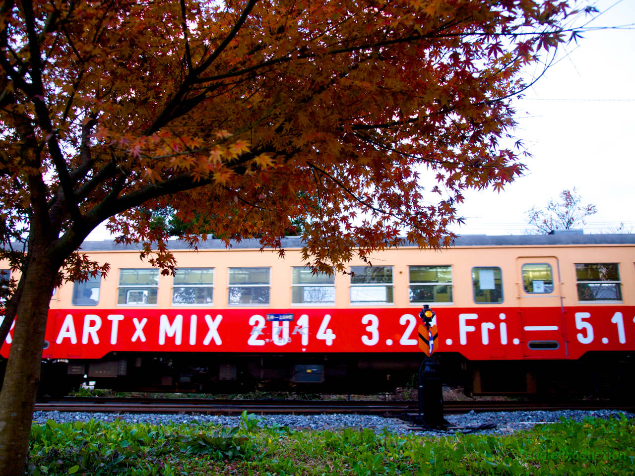 来年開催されるアートミックスの広告列車がモミジの下を走ります。下と言っても、本当は横なんですけどね。催し物が始まるとどれだけの人が来てくれるのか、受け入れ態勢は大丈夫なのか、ちょっと不安になってきます。