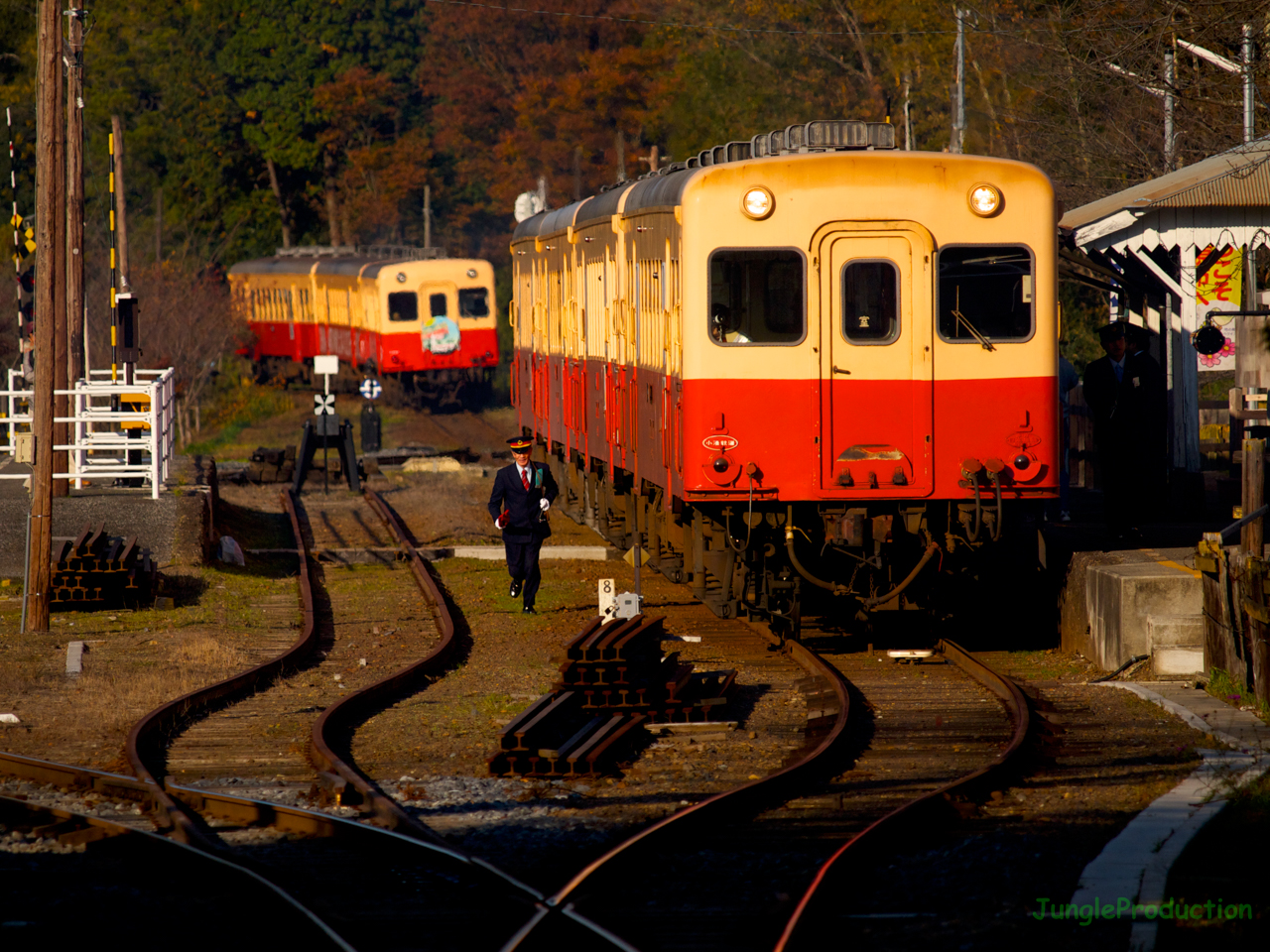 先週土曜日に載せた写真の丁度反対側から撮った写真です。下り列車が4両編成、発車して行った上り列車が3両編成。この写真には、小湊鉄道全稼働車13台のうち、実に半分以上の7台が写っていることになります。