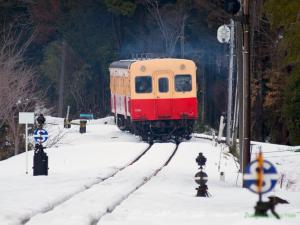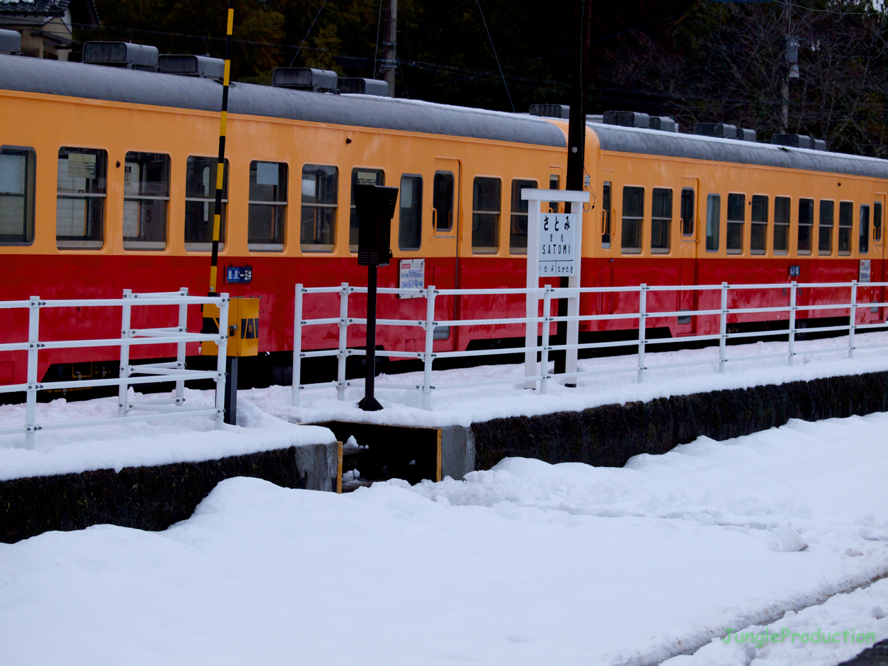 写真は上りホームに停車中の里見駅折り返しの臨時列車。この日は全ての列車が里見駅折り返しとなり、駅長さんは列車が到着する度に雪の中で転轍機を操作。何度も何度も繰り返し、夜にはヘロヘロでした。