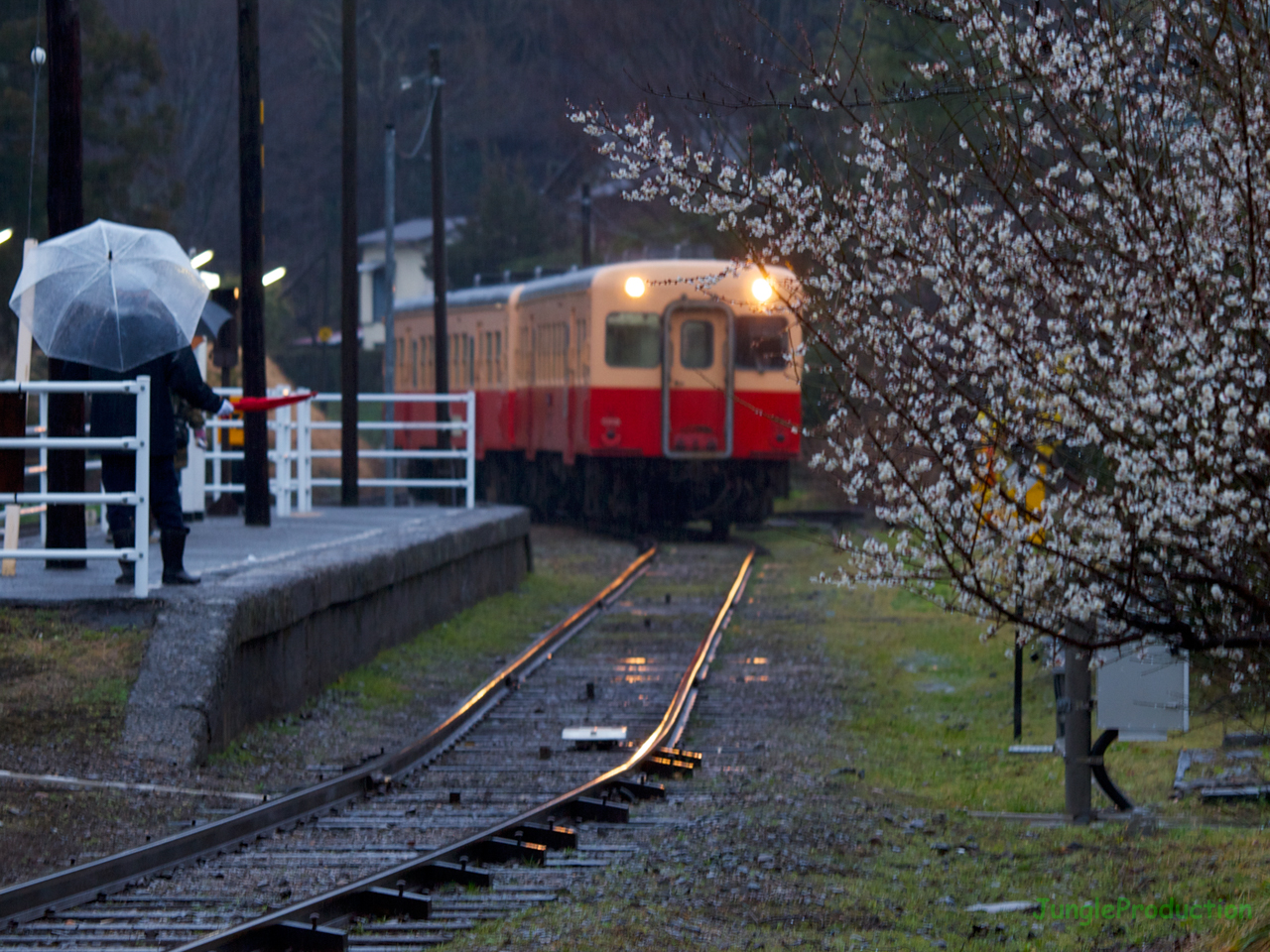 山から下りて来た列車を傘をさした駅員さんが迎えます。そんなひととき、レールが光った瞬間をパチリ。