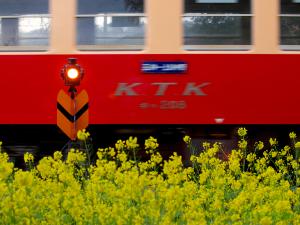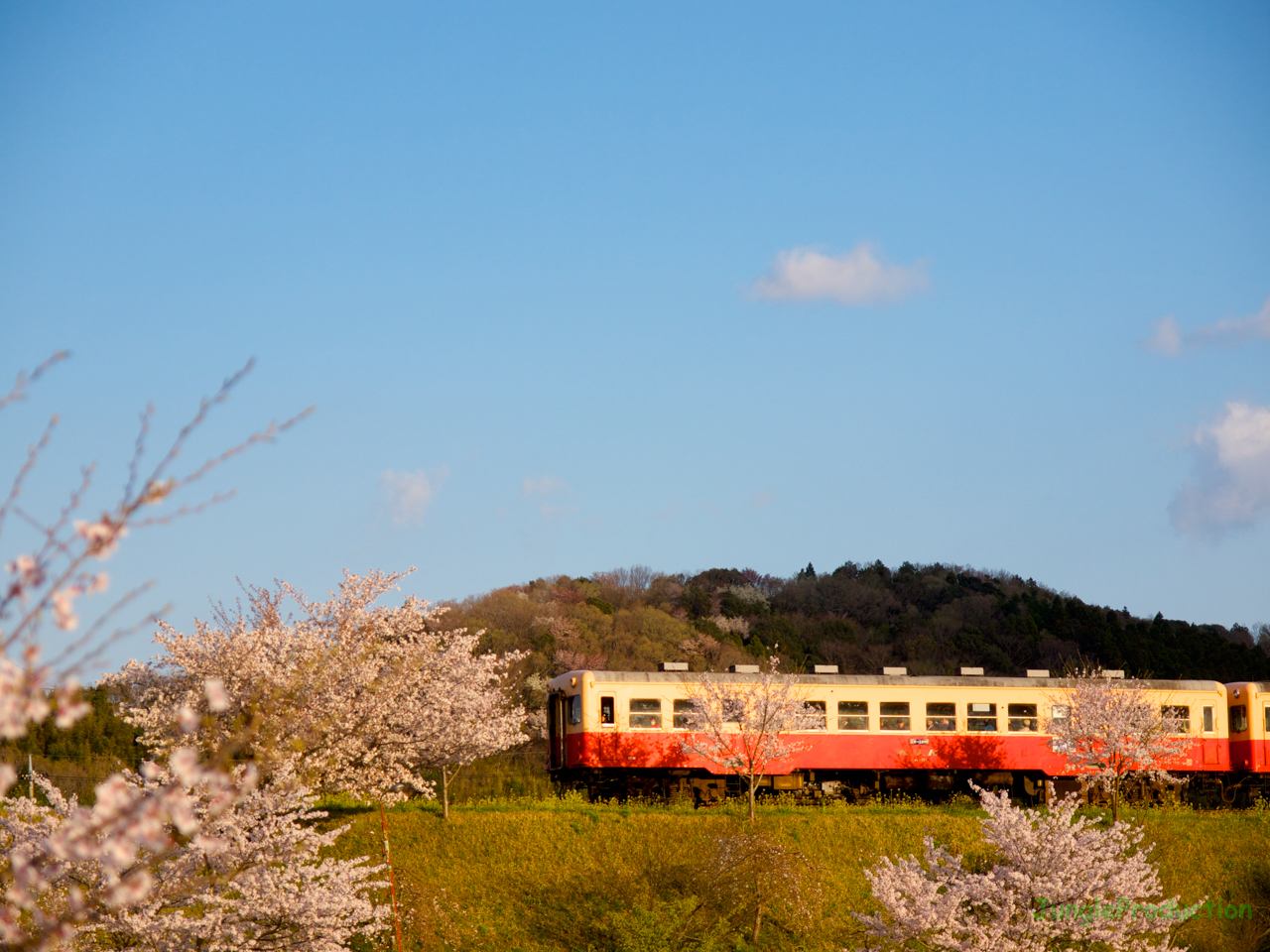 小湊鉄道は、里見駅北側で遊水池を超える為に築堤を渡ります。その築堤と手前の道路脇には沢山のサクラが植えられていて、毎年地元の人たちが観桜会を開いています。この日は、その観桜会に誘われていそいそと出かけたときに撮った一枚。丁度落ちかけた太陽に照らされたサクラと築堤とキハ。空は青く、気持ちの良い一日でした。