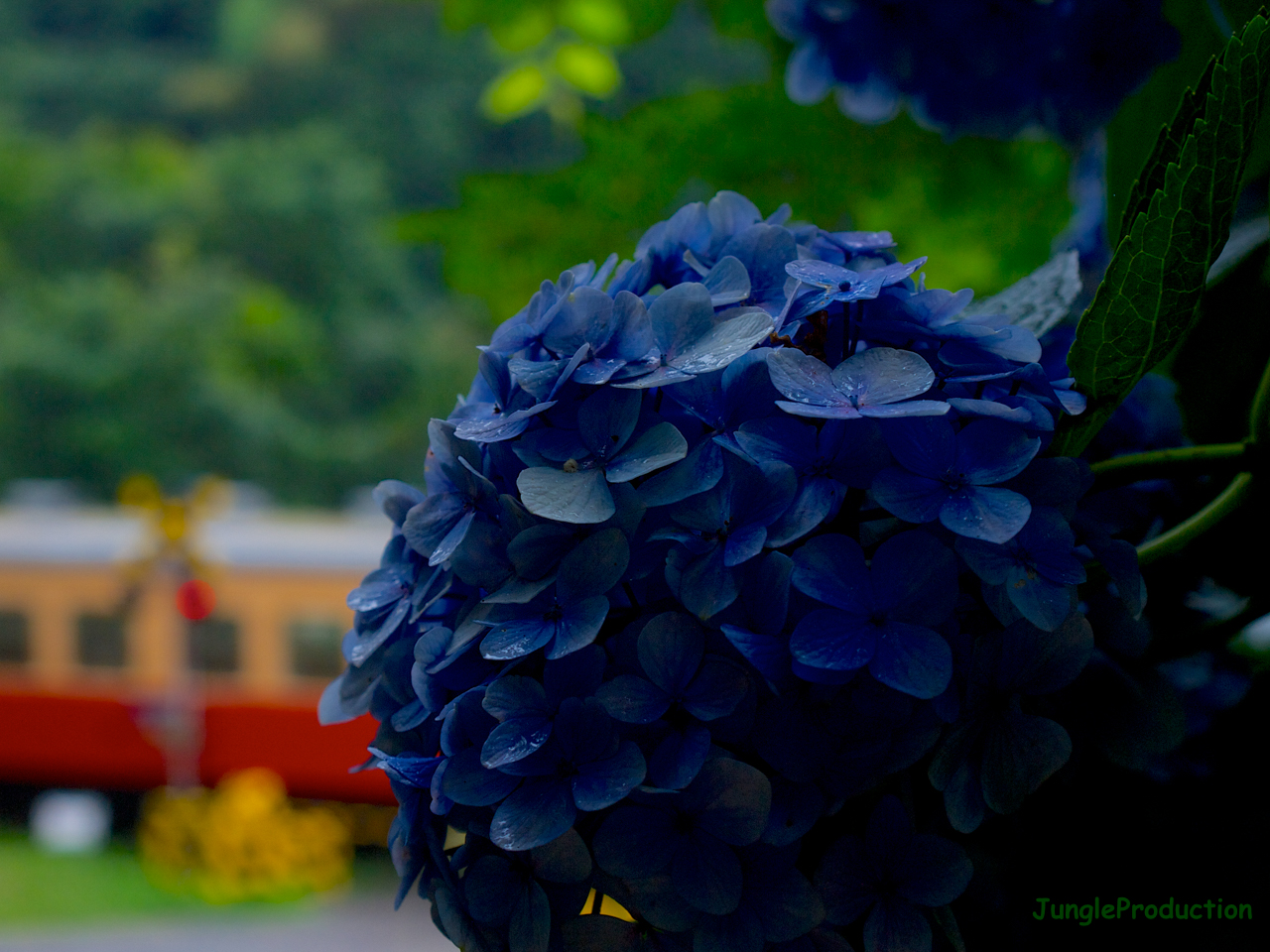 前回撮ったユリの横ではアジサイがまだ咲いていました。ここは一日中陽が当たらないので、他の場所とは違って焼けないのでしょう。直前にざっと降ったにわか雨が花を濡らして、少しは雰囲気が出たのではないでしょうか。そんなところに小湊鉄道のキハが踏切を鳴らしてやって来ました。