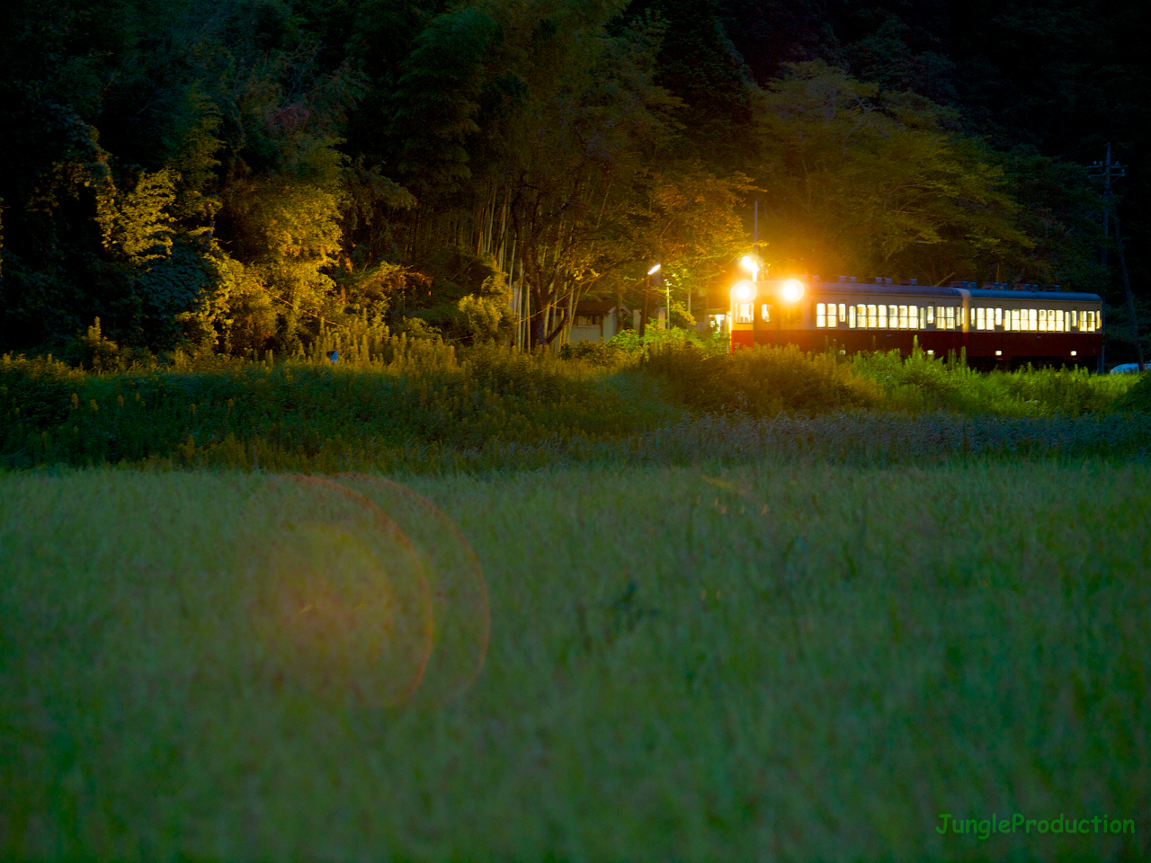 昼が弱って夜が勢いを増すとき、山の向こうから気動車がやってきました。
