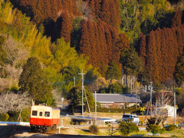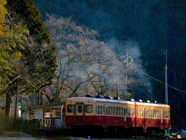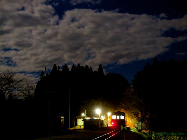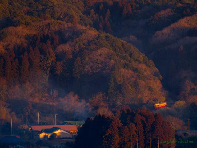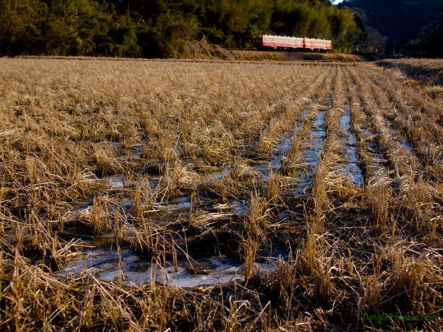予想最低気温はマイナス7℃でしたが、実際は0℃かそれくらいだったのではないでしょうか。それでも田んぼの水には氷がはっていて、寒さがますますしみてきます。そんな田んぼの先を2輛のキハが通り過ぎて行きます。きっと車内は暖かいんでしょうね。