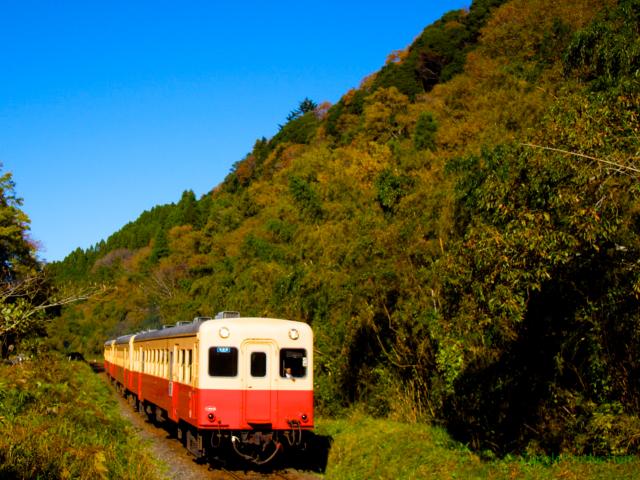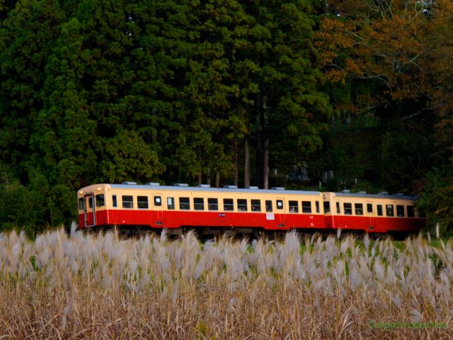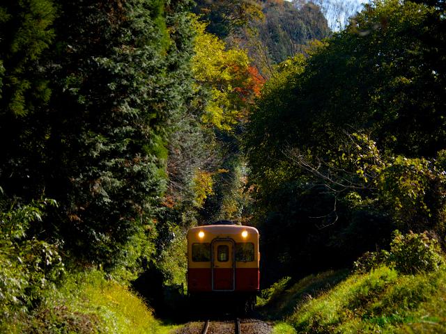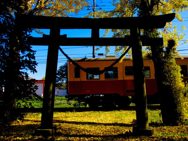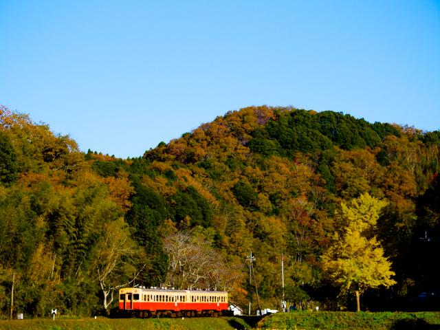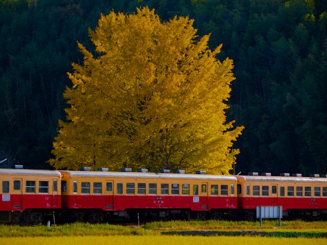 上総久保駅の大イチョウさんです。去年、一昨年と黄色くなる前に落葉してしまってしょんぼりでしたが、今年は見事に黄色くなりました。時間的には本当はこの列車の1本後の方が良いのですが、時間の関係で仕方なく、この列車。この時間だと列車の側面に日が廻...